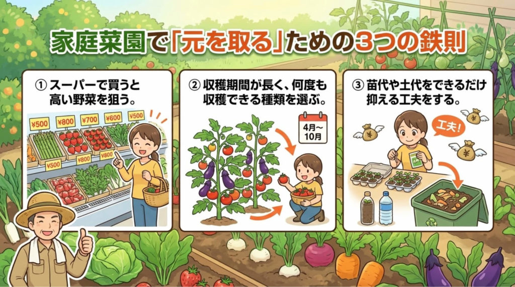 この3つのポイントを押さえるだけで、同じ家庭菜園でも家計への貢献度がぐっと変わります。