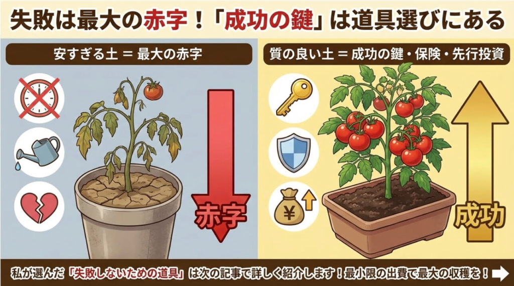 安い土で数十円を節約した結果、かけた時間、水やりや世話の労力、そして期待感のすべてを失うことになります。質の良い土は、失敗を防ぐための「保険」であり、「先行投資」です。