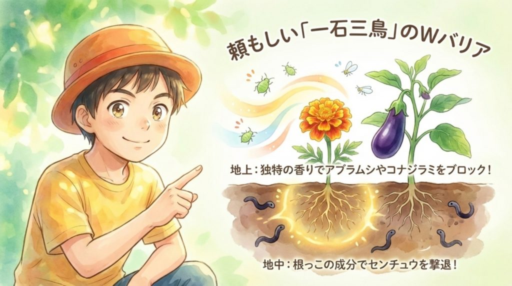 - 💡 畝の端や株間に50センチ間隔で植える(理由:土中センチュウと地上害虫の両方を抑制)