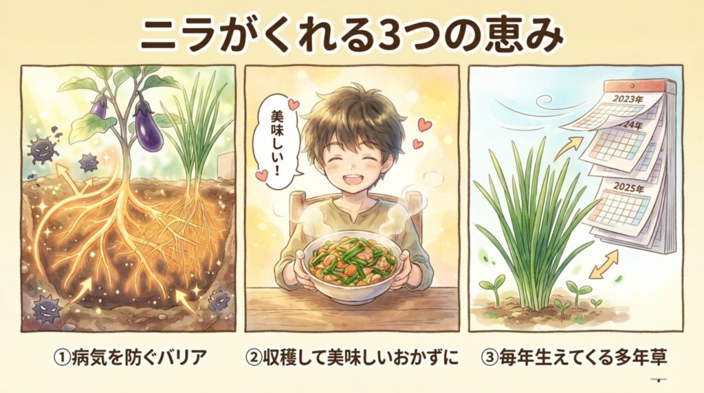 - 📌 ニラの苗を2〜3本添えてセットで定植する
